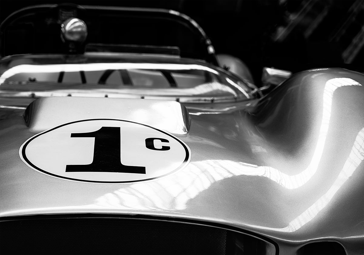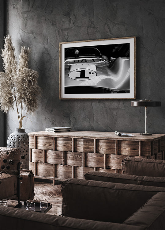 Dieses auffällige Schwarz-Weiß-Poster zeigt die Front eines Oldtimer-Rennwagens mit dem markanten „1c“-Emblem. Die eleganten Kurven, polierten Spiegelungen und zeitlosen Details fangen das goldene Zeitalter des Motorsports ein und machen es zu einem anspruchsvollen Kunstwerk für Oldtimer-Enthusiasten.
