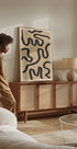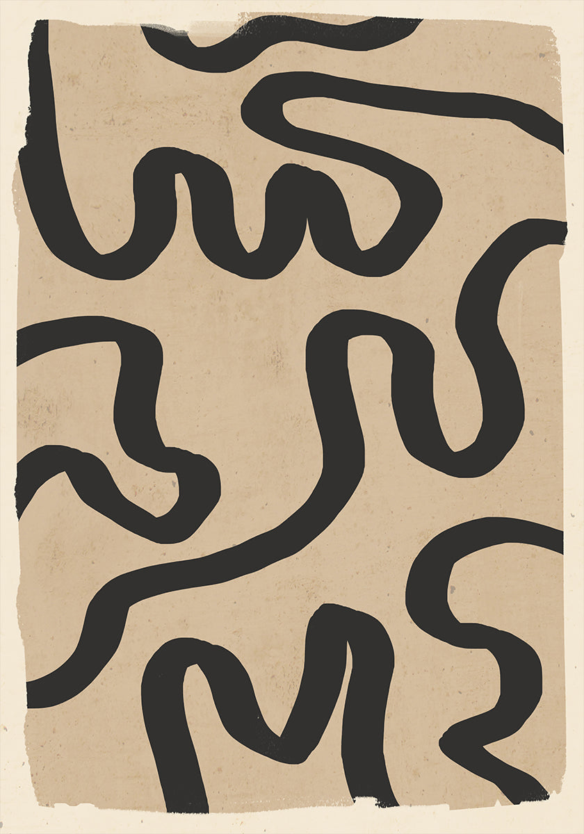 Ein auffälliges abstraktes Line-Art-Poster mit kräftigen schwarzen Strichen, die sich über einen beigen strukturierten Hintergrund schlängeln. Der moderne und minimalistische Ausdruck kombiniert Schlichtheit mit Bewegung, ideal für zeitgenössische, Boho- oder skandinavische Innenräume.