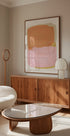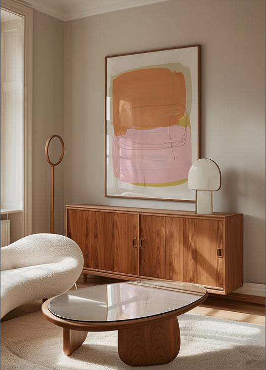 Ein weiches und modernes abstraktes Poster mit malerischen Pinselstrichen in Pfirsich-, Rosa- und dezenten Goldtönen. Die überlappenden Texturen und sanften Linien schaffen eine harmonische Balance aus Wärme und Ruhe – perfekt für minimalistische Innenräume, skandinavisches Dekor oder moderne Galeriewände.