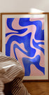 Dieses kühne abstrakte Kunstwerk zeigt fließende blaue Wellenformen vor einem zartrosa Hintergrund. Die dynamischen Kurven erzeugen Rhythmus und Bewegung und verbinden Verspieltheit mit modernem Minimalismus. Ein unverwechselbares Stück, das jedem modernen Raum frische Energie und künstlerisches Flair verleiht.