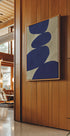 Ein modernes abstraktes Poster mit markanten marineblauen organischen Formen, gestapelt in einer ausgewogenen, steinähnlichen Anordnung auf einem strukturierten beigen Hintergrund. Das minimalistische Design und die beruhigende Farbpalette schaffen eine anspruchsvolle Ästhetik, perfekt für japanische, skandinavische oder moderne Innenräume.