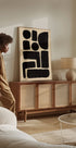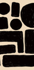 Ein modernes abstraktes Kunstwerk mit auffälligen schwarzen Formen, verstreut auf einem warmen beigen Hintergrund. Die strukturierten Pinselstriche und organischen Formen schaffen ein Gefühl von Ausgewogenheit und Einfachheit – ideal für skandinavische, japanische oder moderne Innenräume.