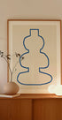 Ein minimalistisches abstraktes Poster mit der Silhouette einer Vase, die in einer kräftigen blauen Linie vor einem sanften beigen Hintergrund gezeichnet ist. Mit einfacher Geometrie und klaren Linien fängt dieses Kunstwerk skandinavische Eleganz und zeitgenössische Innenarchitekturtrends ein und eignet sich perfekt für ein ruhiges und modernes Zuhause.