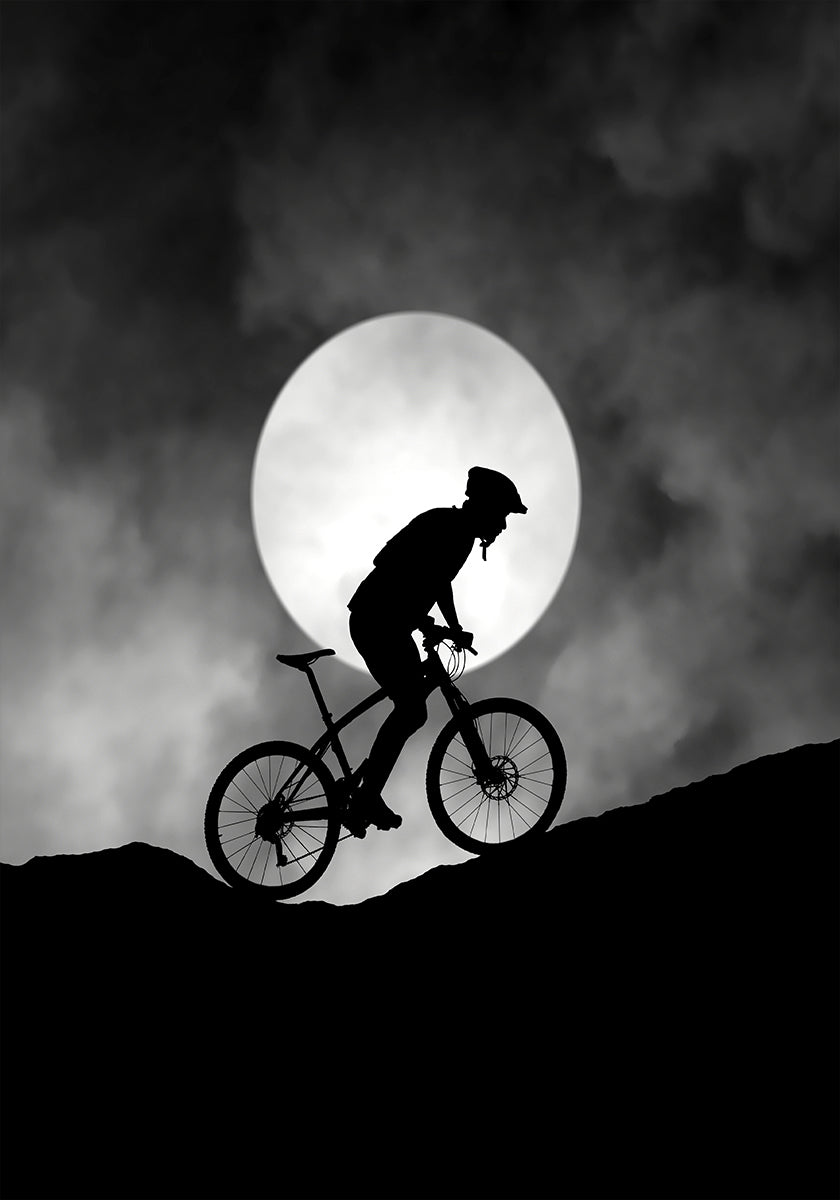 Ein kraftvolles Schwarz-Weiß-Silhouettenbild eines Radfahrers, der bei hellem Vollmond bergauf fährt. Der dramatische Kontrast zwischen Licht und Schatten schafft eine surreale und abenteuerliche Szene, die den Nervenkitzel des Nachtreitens, die Entschlossenheit und Ausdauer vor dem Hintergrund der Natur einfängt.