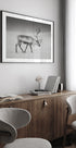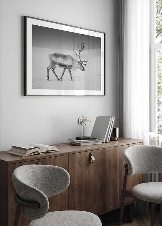 Eine einsame Rentiersilhouette steht in der arktischen Einöde, umgeben von endlosen, schneebedeckten Weiten und einem ruhigen, windgepeitschten Horizont. In Schwarz und Weiß werden die skulpturalen Linien der Geweihe und die raue Ruhe des Winters hervorgehoben. Ein Bild der Stille und Stärke von Giovanni Venier – perfekt für den nordischen Minimalismus. Schafft Ruhe im Wohnzimmer, Schlafzimmer oder Büro.
