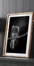 Ein beeindruckendes Schwarz-Weiß-Foto einer Eule, die auf einem Ast sitzt und ihre durchdringenden Augen voller Geheimnisse zeigt. Die monochromen Töne heben jede Feder und jeden Schatten hervor und schaffen so ein dramatisches, zurückhaltendes Porträt, das die Essenz der Tierwelt, der Nacht und des wilden Geistes der Natur verkörpert.