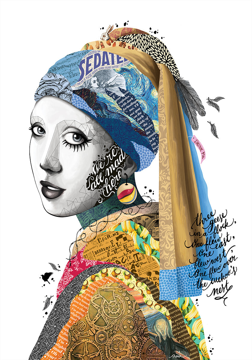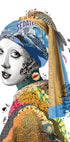 Eine lebendige und vielseitige Pop-Art-Collage, inspiriert von Das Mädchen mit dem Perlenohrring. Das Werk verbindet klassische Porträtmalerei mit moderner Typografie, surrealen Texturen und kulturellen Bezügen. Die spielerische Mischung aus Wörtern, Mustern und Illustrationen schafft eine unverwechselbare und zeitgemäße Interpretation einer zeitlosen Ikone.
