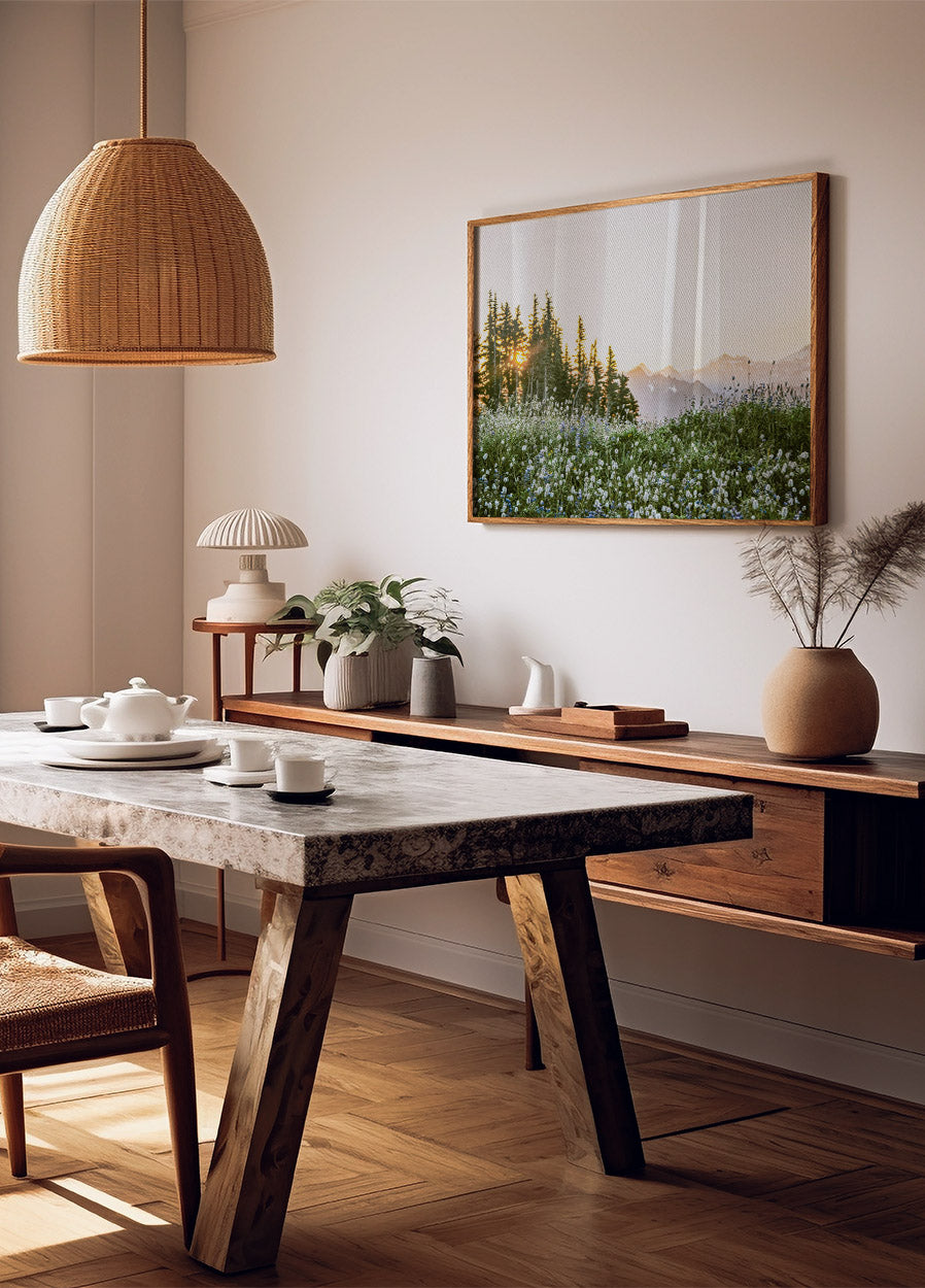 Poster Alpine Morgendämmerung, Wildblumen und Wald Sonnenaufgang