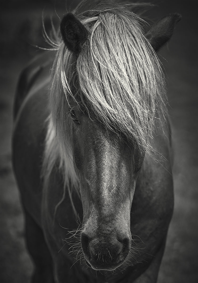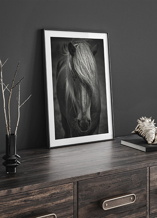 Ein beeindruckendes Schwarz-Weiß-Porträt eines Islandpferdes, dessen Mähne in einem stilvollen, windgepeitschten Look nach vorne fällt. Die monochromen Töne betonen die raue Textur der Haare und die ruhige Kraft des Tieres und schaffen so ein kühnes und dennoch intimes Tierporträt. Perfekt für Naturliebhaber und minimalistische Innenräume.