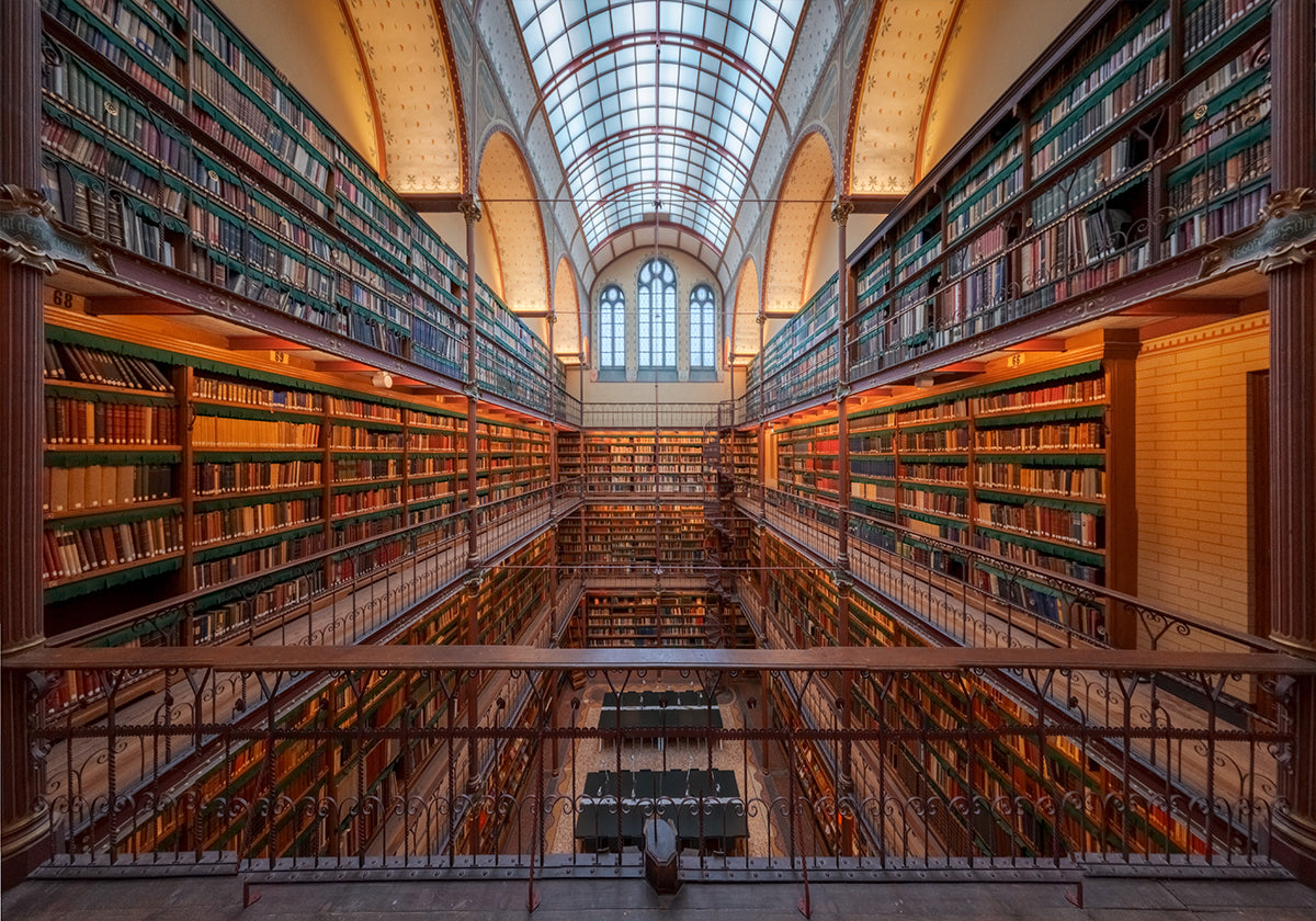 Ein atemberaubender Blick in Amsterdams ikonische Bibliotheksräume: hoch aufragende Bücherregale, elegante gusseiserne Galerien und eine Wendeltreppe, die in sanftes, goldenes Licht getaucht ist. Daniel Viñe fängt die Ruhe und Erhabenheit des kulturellen Erbes der Stadt ein und lädt Sie zu einer Erkundung zwischen den Regalen ein. Ein Hauch zeitloser Symmetrie und stiller Kontemplation.