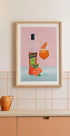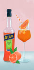 Eine frische und lebendige Illustration von Aperol Spritz mit einer Flasche, Zitrusfrüchten und einem Cocktailglas mit Eis und Orangengarnitur vor einem zartrosa Hintergrund. Dieses legendäre und farbenfrohe Kunstwerk fängt die Essenz der italienischen Sommer- und Aperitivo-Kultur ein und eignet sich perfekt für Küchen, Bars und soziale Räume.