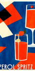 Ein auffälliges und farbenfrohes grafisches Poster des legendären Aperol Spritz-Cocktails mit geometrischen Formen in leuchtendem Orange, Blau, Schwarz und Weiß. Mit seinem modernistischen Design und seiner verspielten Energie fängt das Kunstwerk die Essenz der italienischen Aperitivo-Kultur ein und eignet sich perfekt für Küchen, Bars und soziale Räume.