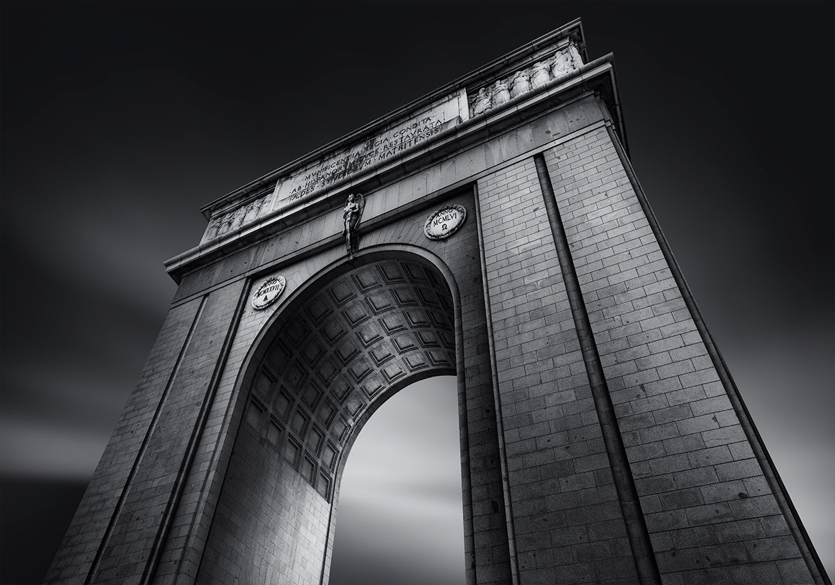 Der Fotograf Jorge Ruiz Dueso rahmt einen monumentalen Triumphbogen in beeindruckendem Schwarzweiß ein und nutzt eine kühne Tiefwinkelperspektive, um seine Wirkung zu verstärken. Feine Steindetails, klare Kontraste und führende Linien führen Sie durch das Portal und beschwören den historischen Rhythmus Madrids und die Romantik Europas herauf. Eine raffinierte Ode an das städtische Erbe.