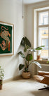 Eine auffällige abstrakte Illustration eines stilisierten Tigers in leuchtenden Farben vor einem kräftigen grünen Hintergrund. Das Kunstwerk kombiniert geometrische Muster, fließende Linien und lebendige Texturen, um eine moderne Interpretation des Katzengeistes zu schaffen. Ein einzigartiges, von Tieren inspiriertes Kunstwerk für Liebhaber modernen Designs.
