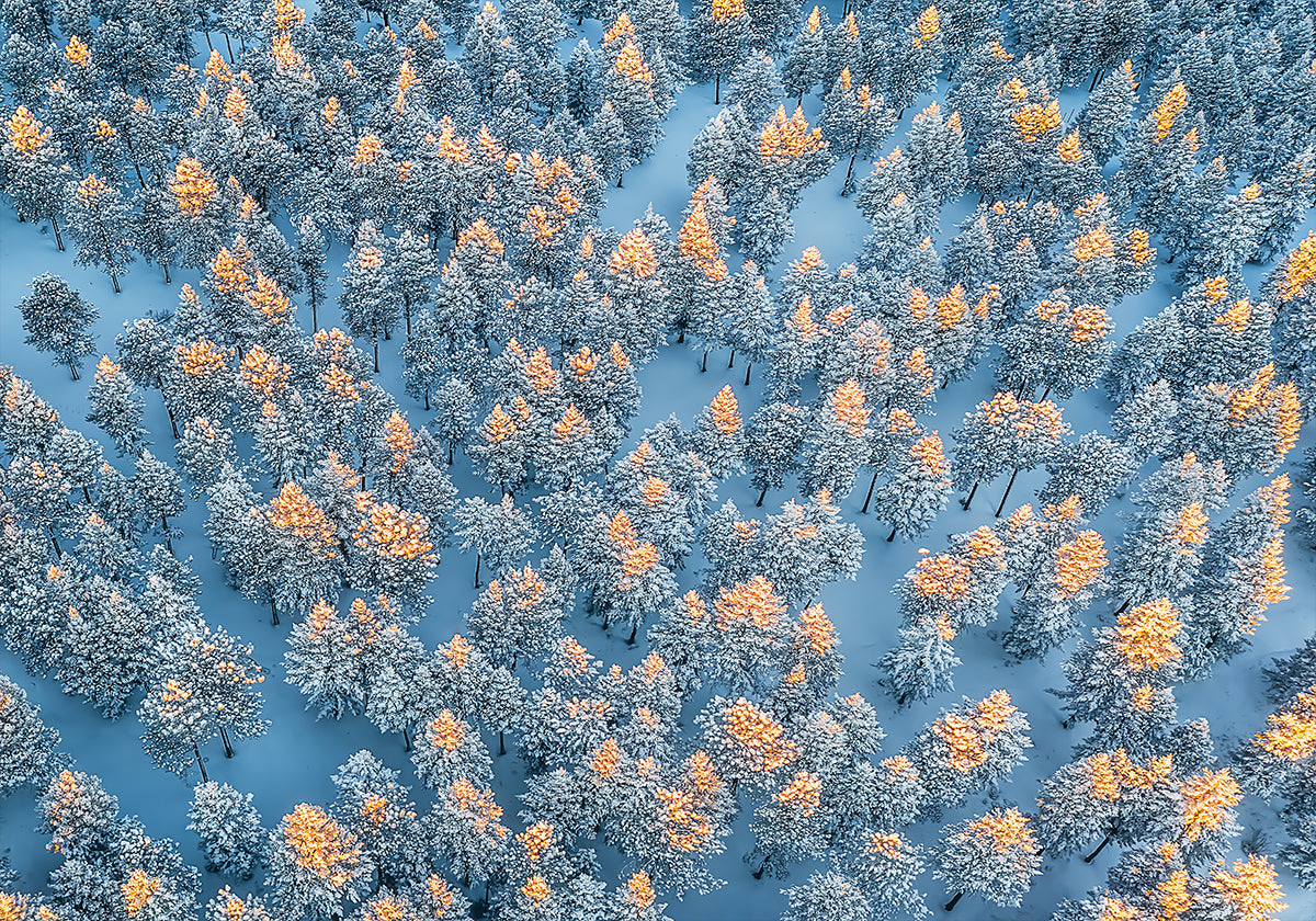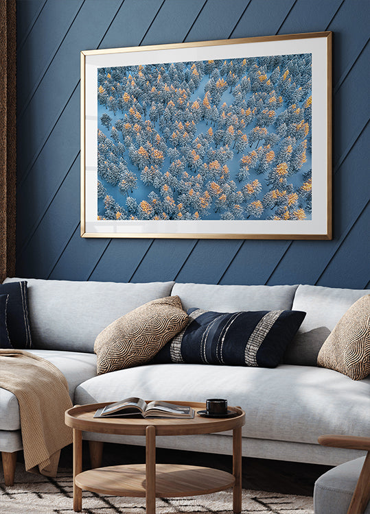 Eine ruhige Winterpoesie von oben gesehen: Schneebedeckte Bäume bilden ein grafisches Muster aus bläulichen Tönen und frostiger Luft. Die luftige Drohnenperspektive verleiht Tiefe und Ruhe, während das Licht subtile Kontraste zwischen Wald und Schnee zeichnet. Eine anspruchsvolle, abstrakte Naturstudie von Mei Xu für moderne Räume. Perfekt als ruhiger Mittelpunkt im Zuhause.