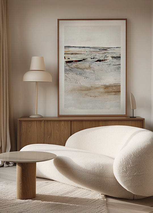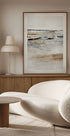Ein ruhiges, abstraktes Küstengemälde von Dan Hobday mit geschichteten Texturen und weichen Pinselstrichen in erdigen Beige-, Weiß- und Rosttönen. Die minimalistische, malerische Komposition erinnert an Küstenhorizonte und verbindet moderne Abstraktion mit natürlicher Ruhe. Ein perfektes Stück für moderne Innenräume mit Küsten- oder minimalistischer Ästhetik.