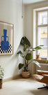 Ein kühnes modernes Kunstwerk mit einer tiefblauen Vase vor einem minimalistischen beigen Hintergrund und einem auffälligen schwarz-weiß karierten Boden. Dieses geometrische und zeitgenössische Stillleben kombiniert Abstraktion mit Innenarchitekturästhetik und schafft einen stilvollen visuellen Mittelpunkt.