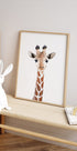 Ein wunderschönes High-Key-Porträt eines Giraffenkalbs, aufgenommen vor einem reinweißen Hintergrund. Die eleganten Muster, die sanften Augen und der lange Hals unterstreichen die Anmut und Schönheit dieses jungen Wildtiers. Perfekt für das Kinderzimmer, Tierliebhaber oder moderne minimalistische Innenräume.