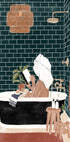 Eine gemütliche Illustration einer Frau, die sich in einer Badewanne entspannt und mit einem Handtuch um den Kopf ein Buch liest. Umgeben von moderner Badarmatur, warmen Erdtönen und einem Hauch Grün strahlt das Werk Ruhe und Gelassenheit aus. Perfekt, um eine entspannte Atmosphäre im Zuhause zu schaffen.