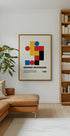 Ein unverwechselbares Bauhaus-Ausstellungsplakat von 1923 mit kräftigen geometrischen Formen in Rot, Blau, Gelb und Schwarz. Dieses Vintage-inspirierte Design ist eine Hommage an die Bauhaus-Bewegung mit abstrakten Formen, klaren Linien und einem minimalistischen Layout. Ein zeitloses Stück Art Deco und modernistische Designgeschichte.