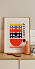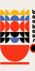 Ein farbenfrohes, vom Bauhaus inspiriertes Poster mit geometrischen Formen, die wie eine Kaffeetasse angeordnet sind. Mit kräftigen roten, gelben, blauen und schwarzen Elementen bringt dieses Retro-Design einen nostalgischen 70er-Jahre-Touch in moderne Innenräume. Perfekt für Küchen, Cafés oder für alle, die Vintage-Design mit Bauhaus-Touch lieben.