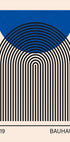 Ein auffälliges abstraktes Bauhaus-Plakat aus dem Jahr 1919 mit schwarzen konzentrischen bogenförmigen Linien, die ein hypnotisches Muster bilden, überlagert von einem kräftigen blauen Halbkreis. Das minimalistische Design schafft Harmonie und Ausgewogenheit und spiegelt perfekt die Bauhaus-Philosophie wider, Geometrie, Einfachheit und Ausdruck zu vereinen. Ein zeitloses Stück für moderne Innenräume und Bauhaus-Enthusiasten.