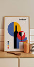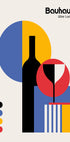 Ein modernes, vom Bauhaus inspiriertes Poster mit einer Weinflasche und einem Weinglas, stilisiert mit kräftigen geometrischen Formen in Schwarz, Rot, Gelb und Blau. Dieses abstrakte Design kombiniert die Eleganz des Weins mit der zeitlosen Bauhaus-Ästhetik, perfekt für Bars, Küchen, Esszimmer und Weinliebhaber.