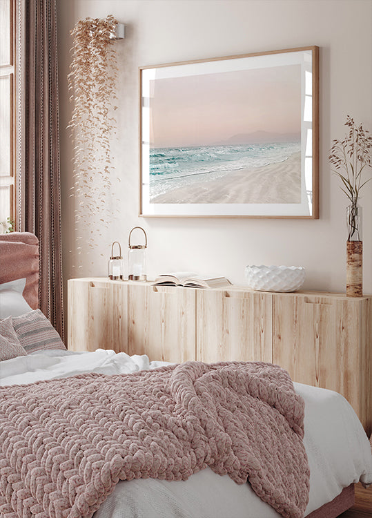 Ein friedliches Küstenfoto, das türkisfarbene Wellen einfängt, die unter einem dunstigen, pastellfarbenen Himmel sanft an einen Sandstrand plätschern. Die fernen Berge bilden einen verträumten Horizont, der Ruhe und Urlaubsatmosphäre hervorruft.