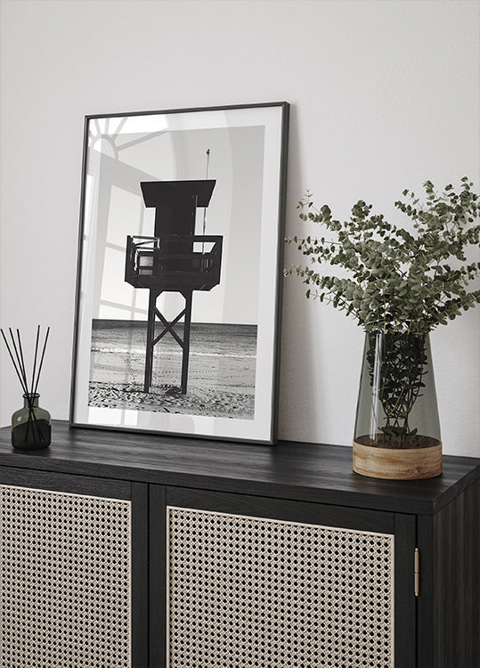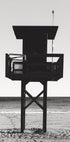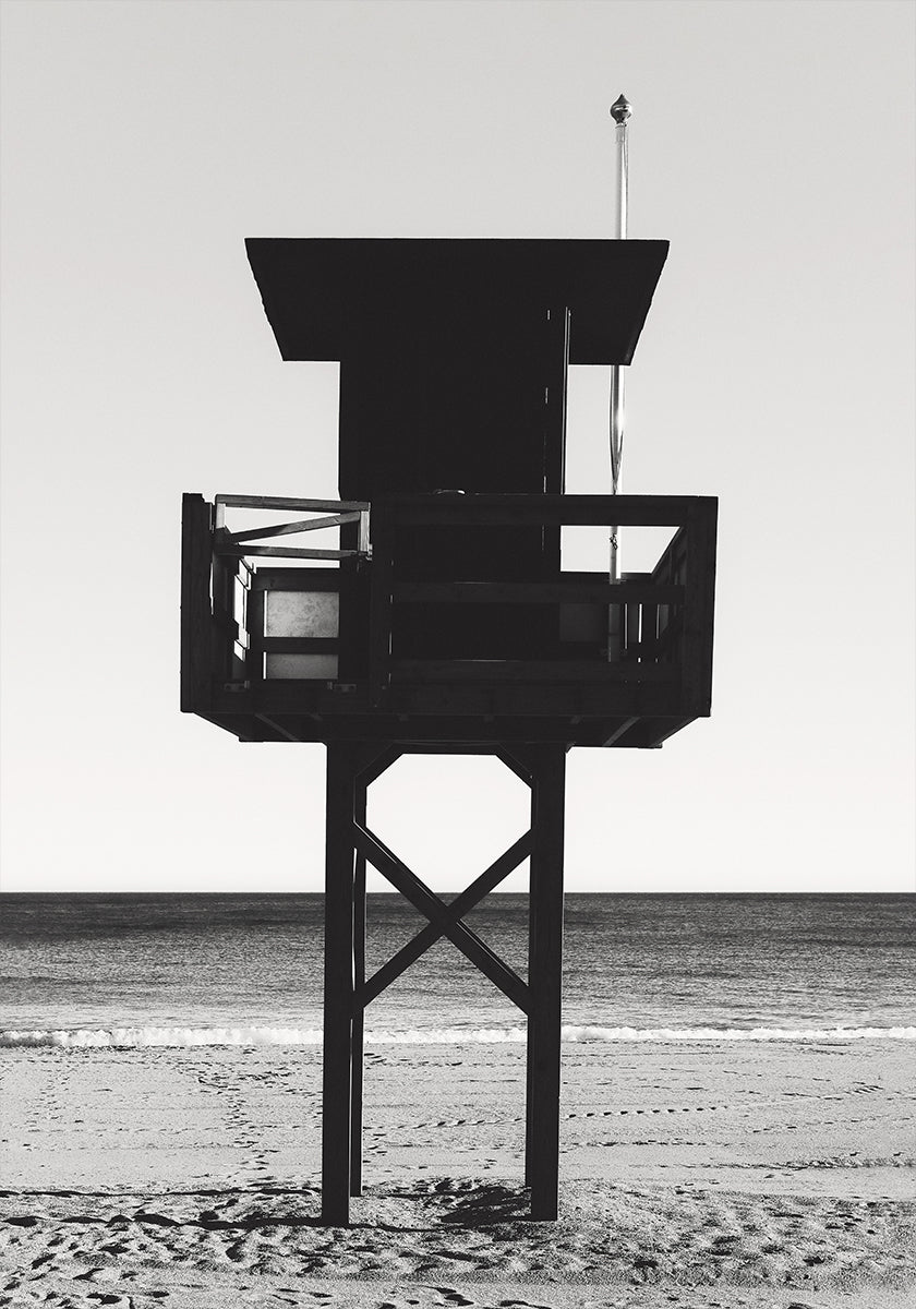 Ein beeindruckendes Schwarz-Weiß-Küstenfoto, das einen Rettungsschwimmerturm zeigt, der hoch am Strand steht. Die starken Kontraste betonen die geometrische Struktur des Turms vor dem ruhigen Meereshorizont. Ein minimalistisches und dennoch kraftvolles Kunstwerk, perfekt für moderne Innenräume mit Küsten- oder Monochrom-Look.