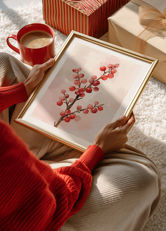 Roter Beerenzweig fängt die Poesie des Winters ein: ein eleganter Zweig mit tiefroten Beeren, der sich deutlich von einem weichen, pastellfarbenen Hintergrund abhebt. Die ruhige Komposition und die gedämpften Farben ergeben einen nordischen, minimalistischen Ausdruck, der eine weihnachtliche Atmosphäre schafft, ohne Lärm zu machen – perfekt für Gemütlichkeit, Flur oder Wohnzimmer. Ein Hauch von Natur, der sowohl zu modernen als auch zu klassischen Räumen passt.