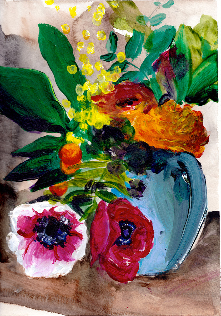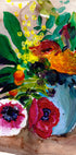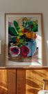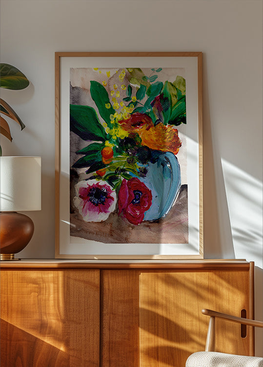 Ein farbenfrohes Blumenstilllebengemälde mit kräftigen Pinselstrichen und lebendigen Farben. Das Kunstwerk zeigt Blumen in einer Vase, in der tiefe Grüntöne, leuchtendes Gelb und markante Rottöne zu einem ausdrucksstarken, malerischen Ausdruck verschmelzen. Perfekt, um Küchen, Wohnzimmern oder Galeriewänden Wärme und künstlerischen Charme zu verleihen.