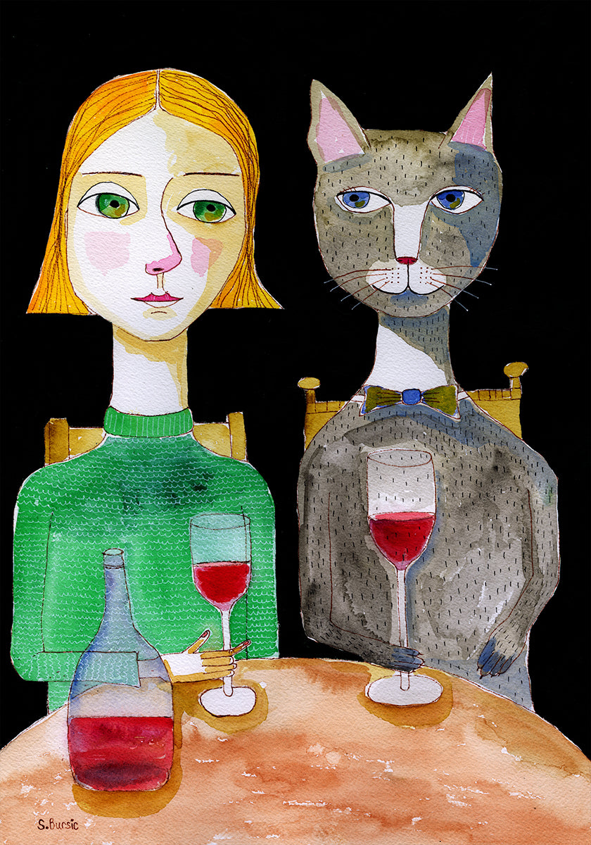 Eine skurrile Illustration einer Frau und einer Katze, die an einem Tisch Wein trinken. Das verspielte und fantasievolle Kunstwerk vereint Humor und Charme, mit kräftigen Farben und ausdrucksstarken Details. Perfekt, um Küchen, Bars oder Galeriewänden eine lustige und künstlerische Note zu verleihen.