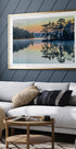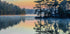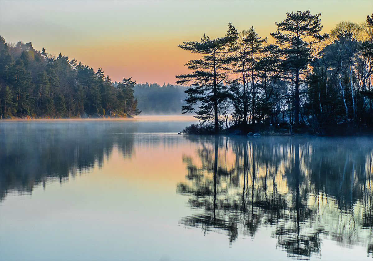 Eine friedliche Seeszene im Morgengrauen, aufgenommen in Schweden, mit Nebel, der über dem stillen Wasser aufsteigt. Das Spiegelbild der Kiefern leuchtet im sanften Sonnenlicht und schafft eine ruhige und meditative Atmosphäre voller Frieden und Harmonie.