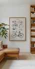 Eine detaillierte Schwarz-Weiß-Illustration von Vintage-Fahrrädern von 1871 bis 2007. Mit ikonischen Modellen wie Kenwood, Columbia und Grand Bi fängt dieses nostalgische Kunstwerk die Geschichte des Fahrrads ein. Perfekt für zu Hause, in Fahrradgeschäften oder um einer Galeriewand Retro-Charme zu verleihen.