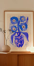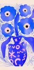 Eine kühne und verspielte Hommage an Matisse mit einer lebhaften Vase voller auffälliger blauer Blumen auf hellem Hintergrund. Das Design kombiniert grafische Muster mit floralen Elementen und schafft ein lebendiges und modernes Stillleben, ideal für zeitgenössische Innenräume.