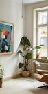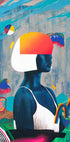 Ein auffälliges Mixed-Media-Kunstwerk mit einer blau getönten Frau mit einer kräftigen, abstrakten Frisur in leuchtenden Farben. Das Werk kombiniert Graffiti, Pinselstriche und Collageelemente zu einem kraftvollen, modernen Ausdruck zeitgenössischer Straßenkunst.