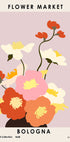 Ein auffälliges und modernes Blumenposter mit leuchtenden Blumen in Rot, Rosa, Orange und Weiß. Inspiriert von Vintage-Reiseplakaten unterstreicht dieses Kunstwerk den Charme von Bologna und Italiens floralem Erbe.