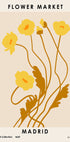 Ein farbenfrohes, grafisches Poster, auf dem sich üppige Blumen in harmonischen Formen rund um die auffällige Typografie „Blumenmarkt – Madrid“ entfalten. Der Ausdruck fängt das Gefühl eines lebhaften Marktes ein: der Duft frischer Blumensträuße, warme Töne und eine spielerische Balance zwischen Text und Motiv, perfekt, um den Raum mit Energie zu versorgen.