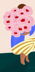 Eine moderne abstrakte Illustration einer Frau, die einen großen Strauß rosa Blumen hält, bemalt in kräftigen und lebendigen Farben. Mit seinen minimalistischen Formen, den gestreiften Hosen und dem modernen Design passt dieses Kunstwerk perfekt in stilvolle Innenräume. Eine verspielte und dennoch elegante Wanddekoration.