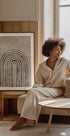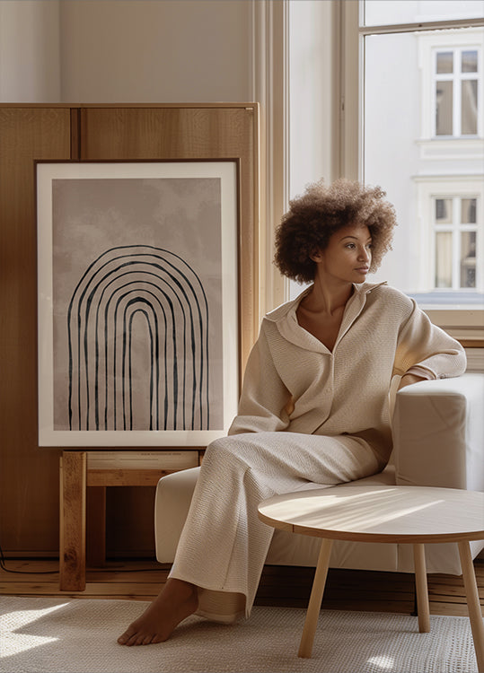 Grafisches und minimalistisches Motiv mit schwarzen Bögen, die sich in rhythmischen Schichten auf einem warmen beigen Hintergrund erheben. Die klare Symmetrie und der Hell-Dunkel-Kontrast erzeugen Ruhe, Tiefe und Richtung. Ein zeitloser Blickfang, der dem Wohnzimmer, der Eingangshalle oder dem Heimbüro Balance verleiht. Passt wunderbar in nordische, moderne und japanisch inspirierte Räume.
