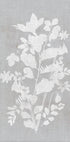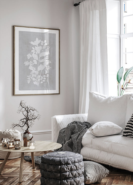 Ein minimalistisches botanisches Illustrationsposter mit zarten weißen Blumensilhouetten vor einem weichen grauen Hintergrund mit Leinenstruktur. Elegante und moderne Wandkunst, die jedem Raum Ruhe und Raffinesse verleiht, perfekt für skandinavische, japanische und minimalistische Innenräume.