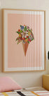 Ein surreales und verspieltes Kunstposter mit einem Strauß lebendiger Vintage-Blumen, arrangiert in einer Eistüte vor einem sanften pfirsichrosa Hintergrund. Dieses einzigartige Collage-Kunstwerk vereint Natur und Nostalgie und ist ein perfektes Statement-Stück für moderne, Retro- und eklektische Innenräume.