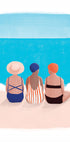 Eine helle und fröhliche Illustration von drei Frauen, die zusammen am Meer sitzen und die Sonne und die Aussicht genießen. Ein perfektes Kunstwerk, um ein Gefühl von Urlaub, Entspannung und Sommerstimmung von der Küste in Ihr Zuhause zu bringen.