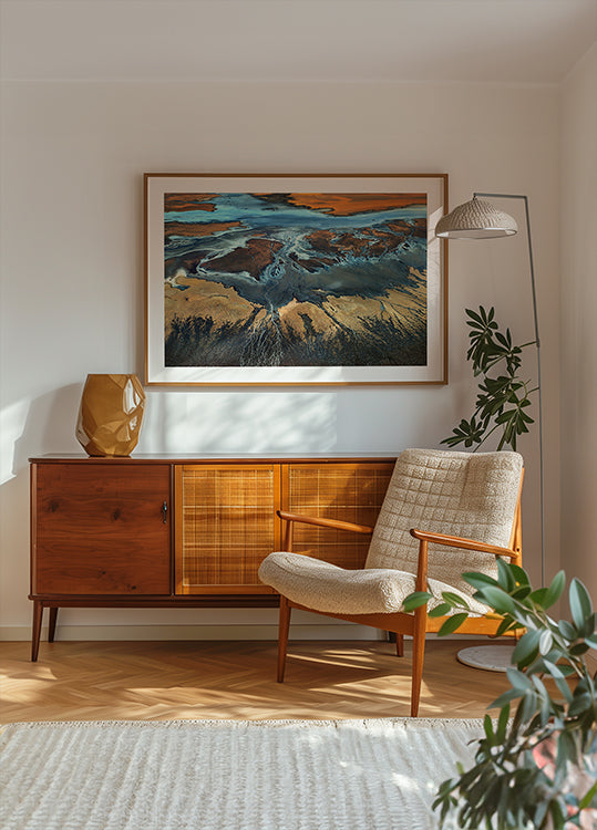 Eine atemberaubende Luftaufnahme der kalifornischen Wüstenlandschaft, die die kunstvollen Bäche und Deltas der Natur über den Sanddünen zeigt. Die komplizierten, aderartigen Muster in Blau und Gold schaffen ein abstraktes Meisterwerk, in dem sich Erde und Wasser in Harmonie vereinen. Ein auffälliges fotografisches Wandkunstwerk für moderne Innenräume.