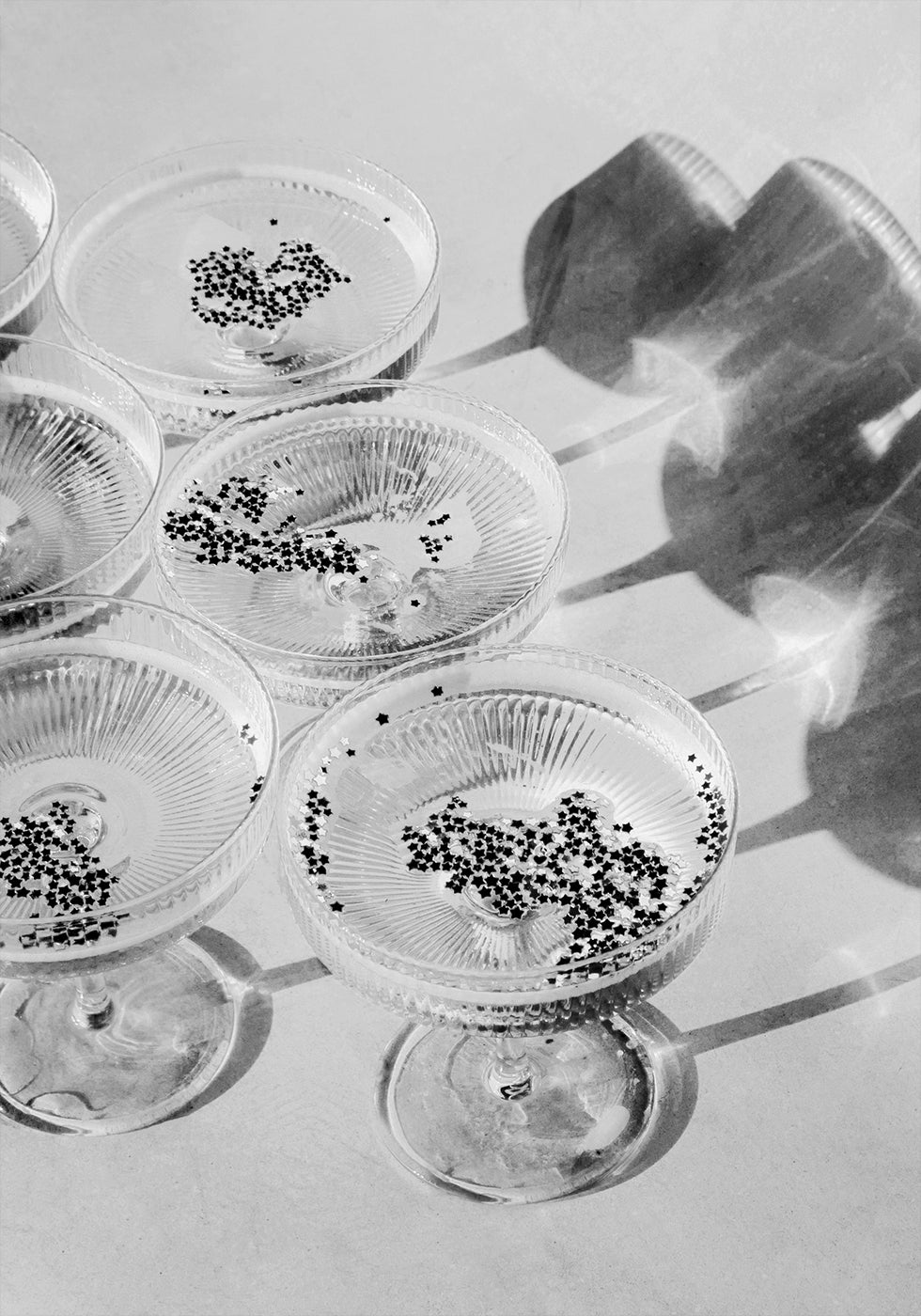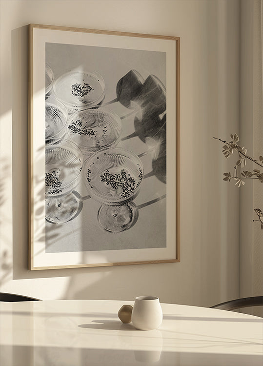 Ein raffiniertes Schwarz-Weiß-Poster, das einen feierlichen Moment mit prickelnden Champagnergläsern einfängt. Dieses zeitlose Foto verleiht modernen Häusern Eleganz und Glamour – ideal für das Wohnzimmer, die Bar oder das Esszimmer.