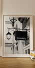 Ein raffiniertes Schwarz-Weiß-Foto des legendären Chanel-Zeichens in Paris. Mit seinen klaren Linien und eleganten Kontrasten drückt dieser Druck zeitloses französisches Luxus- und Modeerbe aus und wird zu einem stilvollen Statement für Innenräume, die Stil, Eleganz und die ikonische Pariser Kultur zelebrieren.