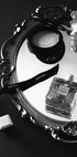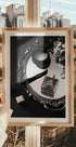 Ein stilvolles Schwarz-Weiß-Foto von Chanel-Schönheitsprodukten mit dem ikonischen Parfüm von Gabrielle Chanel, einem eleganten Band und raffinierten Details auf einem Vintage-Spiegel. Dieser Druck drückt zeitlosen französischen Luxus und Raffinesse aus und wird zu einem eleganten Statement in Innenräumen, die von Mode, Schönheit und klassischer Eleganz inspiriert sind.