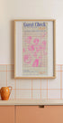 Ein verspieltes und trendiges Poster, das eine Restaurant-Gästekarte im Vintage-Stil zeigt, überlagert mit rosa Skizzenillustrationen von Cocktails und Toastgläsern. Die Mischung aus Typografie und Grafik schafft ein kühnes, modernes Design, das sich perfekt für Küchen, Bars oder für alle eignet, die ausgefallene Statement-Drucke lieben.