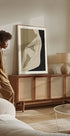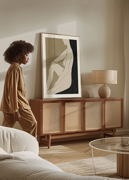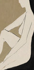 Ein ruhiges und minimalistisches abstraktes Kunstwerk, das eine sitzende weibliche Figur in gedämpften Tönen zeigt. Mit malerischen Pinselstrichen und moderner Schlichtheit drückt das Werk Ruhe und Entspannung aus, ideal für moderne Innenräume und künstlerische Wanddekoration.