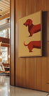 Eine verspielte, minimalistische Illustration eines Dackels, humorvoll dargestellt in zwei separaten Teilen, wobei der lange Körper über die Komposition ausgestreckt ist. Dieses moderne und unverwechselbare Kunstwerk fängt den Charme des beliebten „Wursthundes“ ein und ist perfekt für Hundeliebhaber und moderne Innenräume.